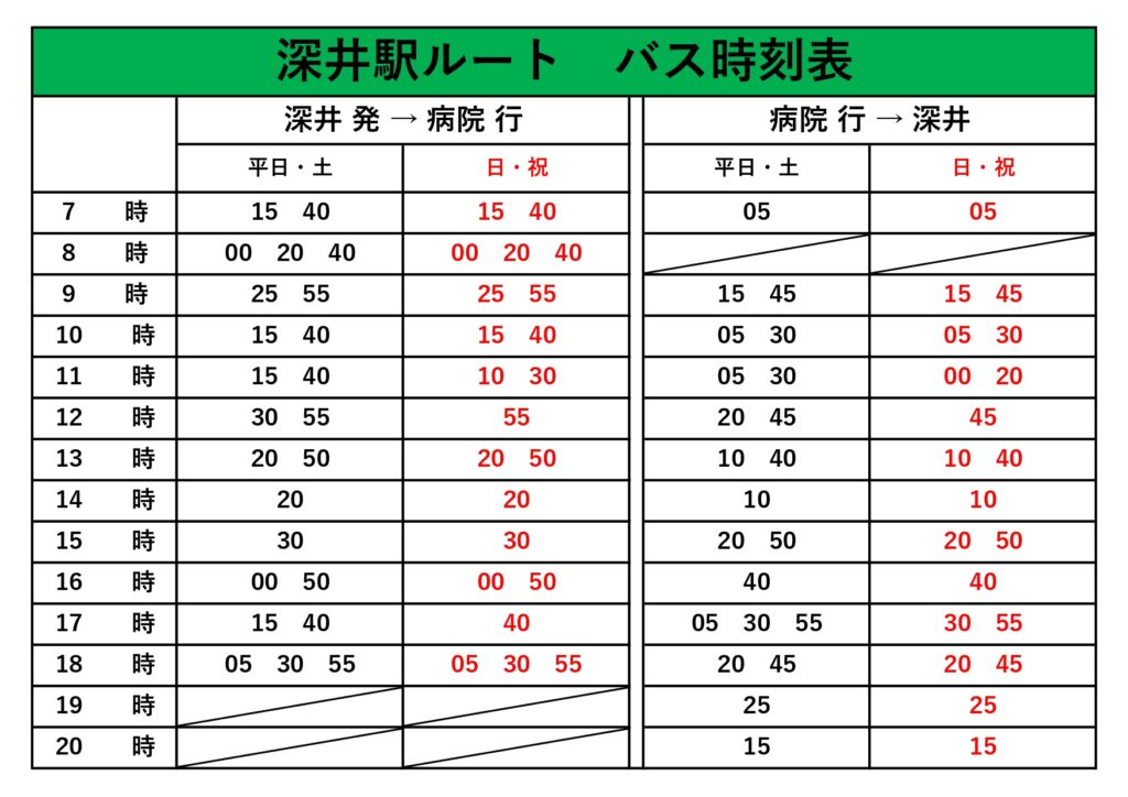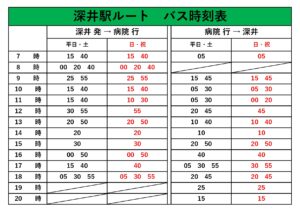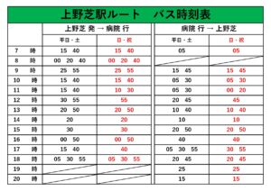 当院の送迎バス(無料)は、病院とJR上野芝駅・泉北高速深井駅間を2台のバスを利用して送迎運行していますが、バスの故障・点検などで、急遽それ以外の車両を利用する場合があります。また、送迎バス乗降車の位置につきましても交通状況により指定された乗降位置を前後することがございますので、あらかじめご了承願い致します。