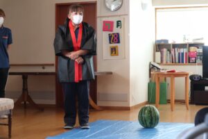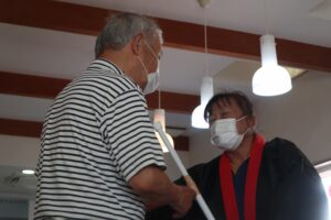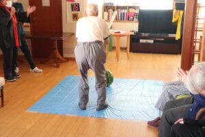 目隠しは安全のためせず、皆さんの掛け声と誘導に合わせて
