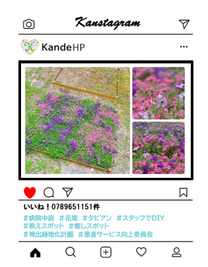 実はこのタピアン、昨年の秋頃に苗を植え、冬の間も職員が交代で世話をしておりました。(花壇の枠も職員の手作りです)中庭は病棟からも見えるので、患者サービス向上委員会で「たくさん花を咲かせて、患者様に喜んでいただきたい」と、花の種類を決めるところから話し合い、一つ一つ計画を進めていきました。