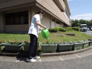 実際に始めてみると、職員が環境に目を向け、外観や病院の中を綺麗にしようという思いを持つことにつながり、「患者さんが喜ぶかな」とか、「病院を訪れてくれた人の心を和ませたい」といった思いが生まれていきました。各部署で当番を決めて、水やりや草刈りなどを始め、しだいに職員から「委員会活動にしてはどうか」という声が上がり、令和5年4月に患者サービス向上委員会を立ち上げました。