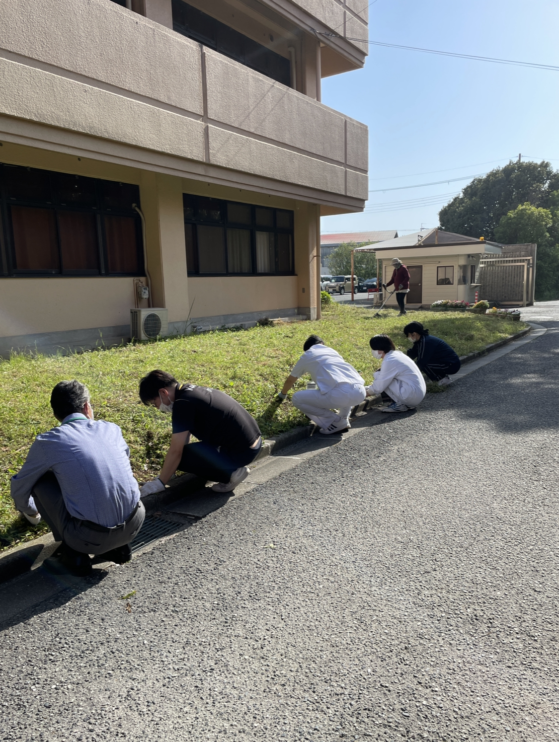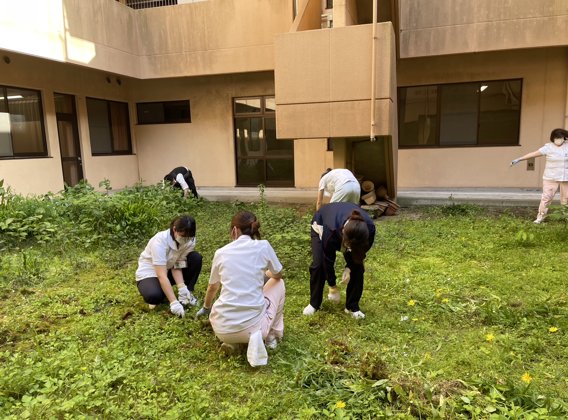 5月17日・23日には、花を植える前の準備として、病棟の中庭や病院の門周辺、駐車場付近の草刈りを実施しました。晴天の下、作業療法室が中心となり、看護部、地域連携室、薬剤部、臨床検査室、心理室、栄養部、事務部の職員が汗をかきながら懸命に草刈りをし、綺麗にすることができました。