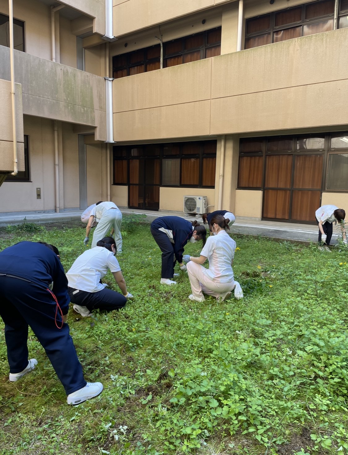 5月17日・23日には、花を植える前の準備として、病棟の中庭や病院の門周辺、駐車場付近の草刈りを実施しました。晴天の下、作業療法室が中心となり、看護部、地域連携室、薬剤部、臨床検査室、心理室、栄養部、事務部の職員が汗をかきながら懸命に草刈りをし、綺麗にすることができました。
