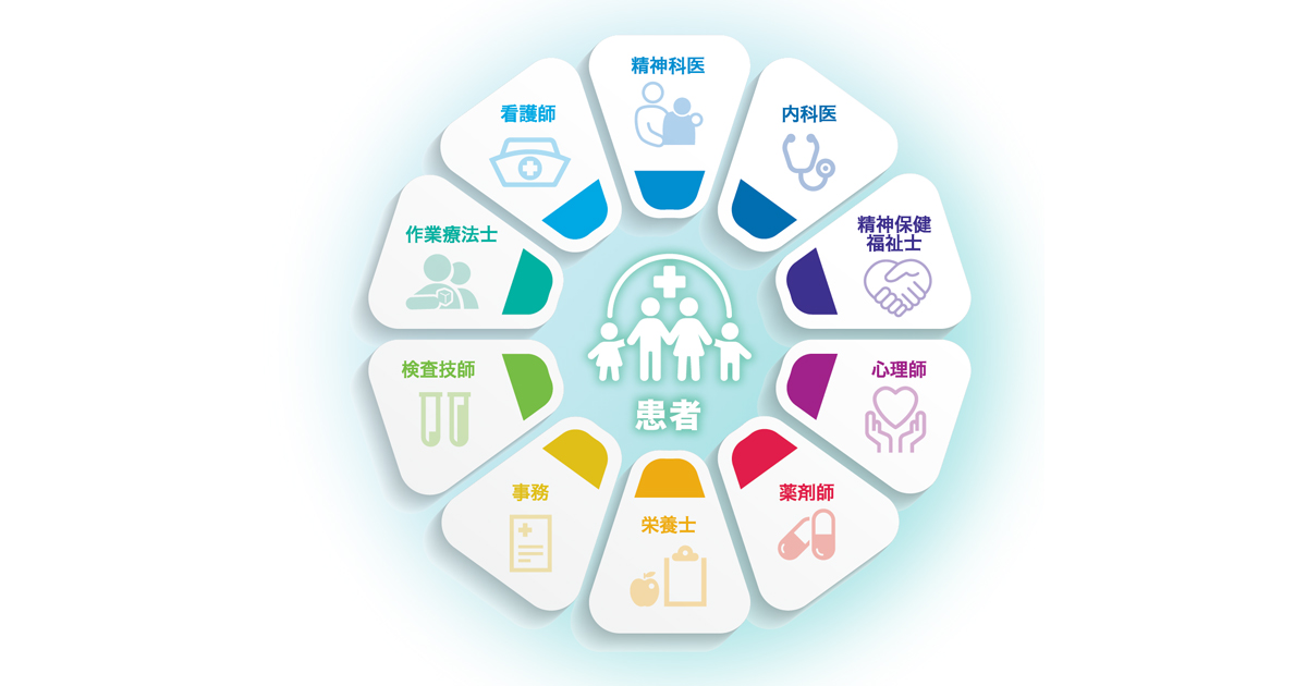 各職種がそれぞれの専門性を活かし、“患者様への理解に基づいた心ある医療”を提供できるよう、チーム医療を実践しています。多職種によるカンファレンス等を通して、患者様自身や症状を理解し、チームで協働しながら、患者様ひとりひとりがその方らしい生活を送れるよう取り組んでいます。