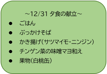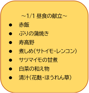 年末年始の行事食は、12月31日夕食に年越しそばを、1月1日~1月3日までおせち等のお正月メニューを提供いたしました。