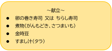 当院はご高齢の方も多く入院されているため、噛み切りにくい海苔の代わりに卵で巻いた『巻き寿司』を提供しました。また、喉詰めが心配な方は『ちらし寿司』に変更し、安全性にも配慮しました。