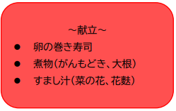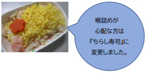 当院はご高齢の方も多く入院されているため、噛み切りにくい海苔の代わりに卵で巻いた『巻き寿司』を提供しました。また、喉詰めが心配な方は『ちらし寿司』に変更し、安全性にも配慮しました。