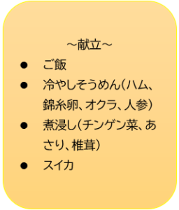 冷やしそうめんはトッピングもさることながら、麺も白と赤(紫蘇)のそうめんを使用して彩りにこだわりました。スイカはとても甘くてみずみずしく、患者様にも好評でした。