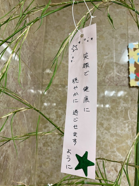 竹は本物にこだわり、猛暑の中レクリエーション委員会のメンバーが切り出してきたものです。病棟でも、患者様の思い思いの短冊が揺れています。